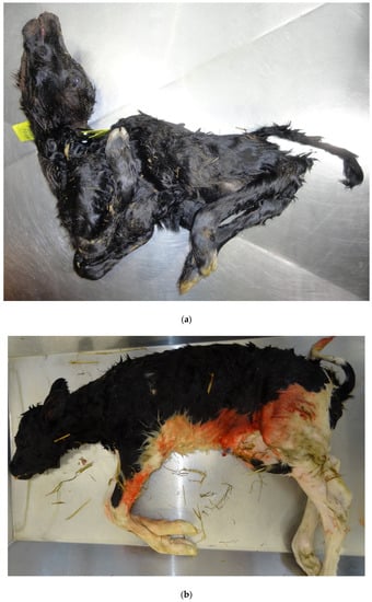 Salmonella species are not commonly detected in PM studies being more commonly detected in aborted foetuses [78] and associated with neonatal calf mortality [79]. The most commonly detected Salmonella species is S. Dublin [78]. Infected foetuses are often autolysed (Figure 3). S. Dublin is more commonly detected in dairy than in suckler foetuses [38]. However, other species, e.g., S. Stanley, have also been detected in cases of PM [27].