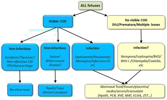 The current state-of-the-art approach to investigation of all-cause perinatal mortality in calves has recently been reviewed [91]. The possible novel diagnostic approaches of the future are presented by Jawor et.al. [2] in Part 2 of this mini-series. The standard operating protocol (SOP) involves three steps: collect a history, examine the pregnant animals and the dam and examine the foetus/placenta. The focus here is on diagnosis of infectious causes only. While the criteria used to diagnose infection as a cause of PM are generally agreed, there are many caveats to the details of such attributions [1]. As with bovine abortions, the more sample material examined (i.e., foetus, and placenta and maternal blood), the higher the likelihood of an aetiological diagnosis [92].