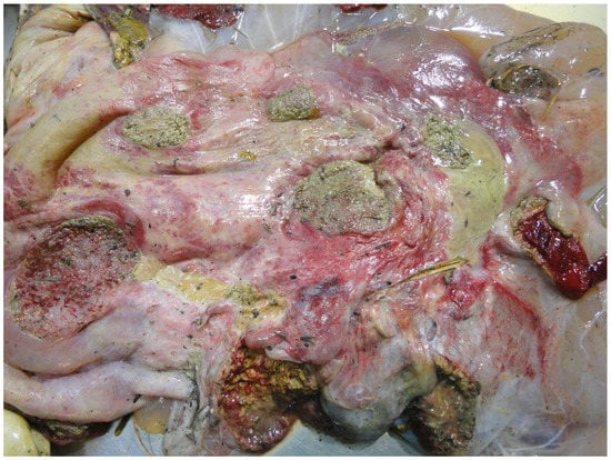 Trueperella pyogenes is not commonly detected in PM studies. Perinatal mortality, usually sporadic, due to T. pyogenes is usually secondary to a maternal suppurative focal infection or bacteraemia, i.e., haematogenous infection [81]. The organism can cause placentitis and foetal pneumonia, pleuritis, pericarditis and/or peritonitis, often in an autolysed foetus (Figure 5). Experimental inoculation studies have shown that T. pyogenes (Actinomyces pyogenes) is a primary pathogen in pregnant cows [81].