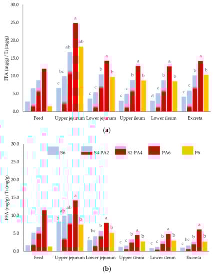 FFA content 1 in the feed, upper jejunum, lower jejunum, upper ileum, lower ileum, and excreta for the five different diets; with 6% of soybean oil (S6), blend with 4% soybean oil and 2% palm fatty acid distillate (S4-2PA), blend with 2% soybean oil and 4% palm fatty acid distillate (S2-2PA), with 6% of palm fatty acid distillate (PA6) and with 6% palm oil (P6) in (a) 11-d-old broiler chickens and (b) 35-d-old broiler chickens. 1 FFA concentration (mg/g)/Ti concentration (mg/g) in each intestinal segment and excreta. Values are pooled means of 6 replicates per each diet with 12 chickens/replicate at 11 d, and 2 chickens/replicate at 35 d. a–d: columns not sharing a common letter within each intestinal segment are significantly different (p ≤ 0.01).