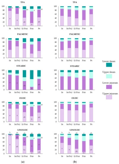 To better understand the importance of the different intestinal segments in the FA absorption, the contribution of each intestinal segment was calculated as a proportion of the total digestibility coefficient obtained in the lower ileum, since it is well known that this is the last segment where absorption can take place [25]. The contributions of the different intestinal segments to the digestibility of TFA and the four major FAs (palmitic and stearic, representing SFA; oleic, MUFA; and linoleic, PUFA) are shown in Figure 2.