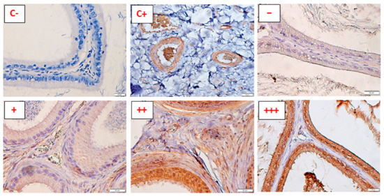 The sections were viewed with an Olympus BX53 microscope coupled with a UP-90 camera (Olympus Polska, Warsaw, Poland), for both the semiquantitative determination of the receptor expression (the intensity of staining scored from “−“, meaning no reaction, to “+++”, meaning a strong reaction, Figure 1), and the localization of the receptors in the smooth muscle and the epithelium of the epididymis and vas deferens. First, the slides were examined under 200× magnification for the uniformity of staining, and then the scoring of the reaction was performed under 400× magnification. At least 5 viewing fields were examined for each slide. The assessment of the slides was made independently by two researchers who were blinded to the sample’s identity. In the case of any incongruity between the assessments, the average result was noted. Different parts of the reproductive tract (the caput epididymis, corpus epididymis, cauda epididymis, and vas deferens) were analyzed separately.