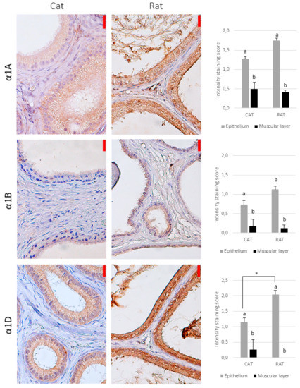 The immunohistochemical localization of the α1-adrenoceptors in the feline and rat reproductive tract − representative pictures of the epididymis (counterstained with Hematoxylin, magnification 400×). The red bar on the upper right of each image represents 20 µm. The graphs on the right present the average reaction intensity score (n = 6). Because of the lack of difference between the regions for most of the receptors investigated, the data are shown as the average intensity of staining for the regions analyzed and SEM, for the sake of clarity. The different letters above the bars (a, b) indicate significant (p < 0.05) differences between the epithelium and muscular layer within a species. An asterisk (*) indicates a significant difference between the species.
