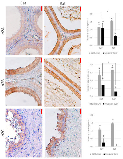 The immunohistochemical localization of the α2-adrenoceptors in the feline and rat reproductive tract − representative pictures of the epididymis (counterstained with hematoxylin, magnification 400×). The red bar on the upper right of each image represents 20 µm. The graphs on the right present the average reaction intensity score (n = 6). Because of the lack of difference between the regions for most of the receptors investigated, the data are shown as the average intensity of staining for the regions analyzed and SEM, for the sake of clarity. The different letters above the bars (a, b) indicate significant (p < 0.05) differences between the epithelium and muscular layer within a species. An asterisk (*) indicates a significant difference between the species.