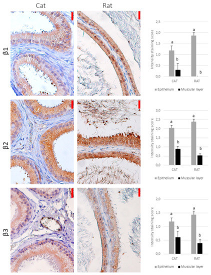 The immunohistochemical localization of the β-adrenoceptors in the feline and rat reproductive tract − representative pictures of the epididymis (counterstained with hematoxylin, magnification 400×). The red bar on the upper right of each image represents 20 µm. The graphs on the right present the average reaction intensity score (n = 6). Because of the lack of difference between the regions for most of the receptors investigated, the data are shown as the average intensity of staining for the regions analyzed and SEM, for the sake of clarity. The different letters above the bars (a,b) indicate significant (p < 0.05) differences between the epithelium and muscular layer within a species. No significant differences between the species were noted.