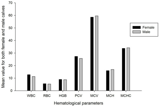 However, there was no significant difference in WBC, RBC, HGB, MCV, MCH, and MCHC between male and female calves. According to Celik et al. [32], HGB and MCH levels were not statistically different between the sex of the calves, which is concordant with our findings. Moreover, Camargo et al. [33] also did not find a significant difference between males and females in MCHC, which is also in line with our result.