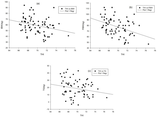 Relationship between THI and IBW (a), THI and FBW (b), and THI and TG (c) THI, IBW, FBW, and TG, are temperature–humidity index, initial body weight, final body weight, and total gain, respectively.