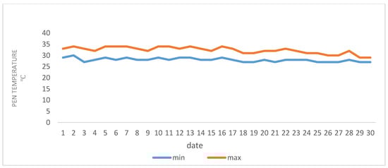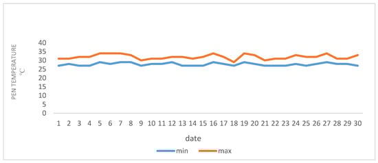 A total of 45 lactating ewes of the Chios cross-breed were randomly selected for twin birth from a flock consisting of 150 ewes, kept on a dairy breeding sheep farm located in the area of Polykastro (Latitude: 41°00′ N; Longitude: 22°33′ E) in the northwestern part of Kilkis in Greece. The daily mean temperature during July and August (2020) ranged between 27–34 °C. Figure 1 and Figure 2 provide temperature data inside the building. The relative humidity was 65% and the average wind speed was one meter per second. The ewes were allocated into three equally sized treatment groups of 15 ewes, each consisting of 5 subgroups housed in a separate pen. Each group and subgroup was balanced for body weight (BW) three weeks after lambing, parity and body condition. The three treatment groups were fed isonitrogenous and isoenergetic diets. Group 1 (Control) was fed the basal ration with Lucerne hay and wheat straw and a concentrate containing maize, soybean meal and sunflower meal as the main constituents (Table 1). The diet of group 2 was supplemented with cornus extract at a level 0.5 g per kg of concentrate and that of group 3 with a cornus extract plus oregano and thyme essential oils, at a level of 0.5 g cornus extract, 0.01 g oregano and 0.005 g thyme essential oil per kg of concentrate, respectively (Cornus and CorOrThym groups). All plant extracts were provided by ORIZON Diatrofiki, Serres, Greece. At the start of the trial, the ewes were in the third month of their second lactation (on average two months after lamb weaning) and were acclimatized to the experimental conditions for two weeks prior to starting. The mean initial BW was 54.4 ± 1.65 kg and the trial lasted for 45 days plus acclimatization of two weeks, and the mean milk yield was 1.73 L/d. The final BW was 55.3 ± 1.44 kg. After weaning, the ewes were machine milked twice daily (at 6:30 and 17:00 h) in a 24-parallel milking parlor with individual ear-tag identification.