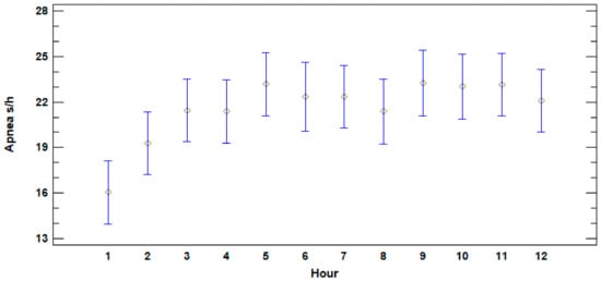 Analysis of recorded data on apnea duration for the first 12 h of life showed a significant difference between the length of apnea during the first hour postpartum (16.04 ± 3.81 s/h) and the apneas during the period 3rd–12th hour (22.32 ± 5.47 s/h) (ANOVA, F = 1.94; p = 0.0395) as shown in Figure 1. Notwithstanding, considering only the neonates that died, no significant differences were observed in the same period of time (ANOVA, F = 0.51; p = 0.8764).
