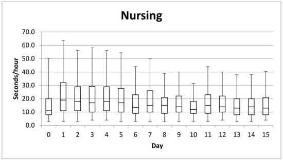 The data analyzed in this study extended to day 15 of the neonates’ life for apnea duration and nursing, to further compare Sweeney et al. (2010) [], who stated that by day 7 to 10 of life data can be already evaluated to determine whether the development of a neonate is as expected.