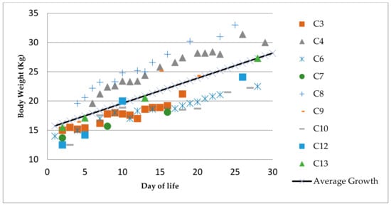Considering the first and last BW, length and girth recorded for those animals with sufficient data (N = 9), the daily growth and increase in body weight was calculated for each individual. These values were used to determine the average daily growth and BW value for the group. In average, the neonates grew 0.521 ± 0.334 cm/d in length, 0.563 ± 0.177 cm/d in girth, and 0.428 ± 0.102 Kg/d. Figure 3 summarizes the recorded BW for each of the nine animals with sufficient data to calculate their average daily growth during the first 30 days of life. Data on C11 were not included as the animal was supplemented with artificial formula, described by Townsend [].