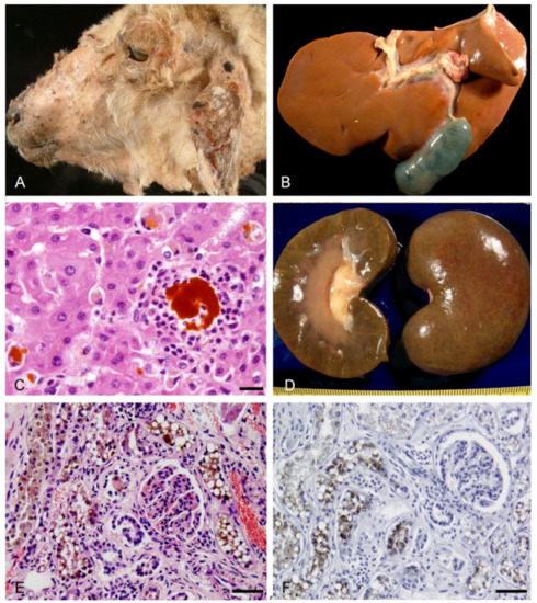 Animals examined at this stage of the disease showed edematous drooping ears, serum exudation and sloughing of the skin in the dorsum of the ears, eyelids, muzzle, lips and forelimbs, characterized histologically by epidermal necrosis and presence of serocellular crusts (Figure 1A). The carcass showed intense jaundice and the liver were bile stained (yellowish) and enlarged (Figure 1B). The extrahepatic bile ducts and the gallbladder were distended by abundant bile and visible brown concretions (pigmented calculi) (Figure 1B). Histologically, in the liver, there was a macrovesicular (large droplet) predominantly periportal fatty change (zone 1). Hepatocytic and canalicular cholestasis with bile granular deposits in the cytoplasm of hepatocytes and presence of bile plugs in canaliculi respectively, confirmed by the Hall histochemical stain, were prominent in centrilobular regions (zone 3). Some of these cells were swollen or necrotic. Small clumps of polimorphonuclear neutrophils (PMNs), Kupffer cells (KCs) with AFIP lipofuscin positive granules, and foreign-body-type giant cells were present surrounding more prominent deposits of bile pigment (‘bile lakes’) (Figure 1C). Portal tracts were edematous with ductular proliferation at the periphery (bile ducts with a well-defined lumen). There was also a mild (sparse) portal inflammation (scattered lipofuscin-laden macrophages, detected by the AFIP method, and lymphocytes). The epithelial cells in septal bile ducts were shrunken with picnotic nuclei, and larger bile ducts were dilated and contained inspissated bile. The kidney was macroscopically slightly enlarged and showed a greenish discoloration with linear green streaks throughout the cortex and medulla (Figure 1D). Diffuse cellular swelling and green granular pigmented bilirubin, in the proximal tubules, as well as green-yellow acellular tubular bile casts in the distal nephron segments of the renal medulla, both confirmed by the Hall histochemical stain, were observed microscopically (cholemic nephrosis) (Figure 1E,F).