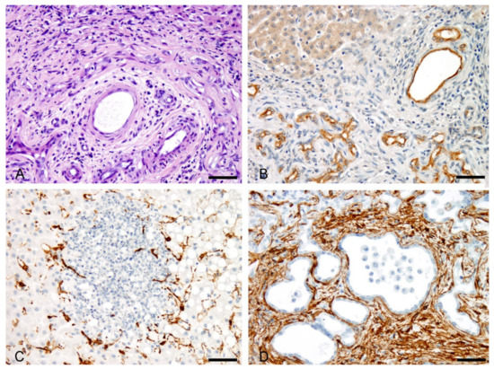 A lymphocytic infiltrate has been observed associated with the chronic hepatic changes of FE [8,10]. The main cell target in cholangiopathies are the epithelial cells lining the bile ducts (i.e., cholangiocytes), that are exposed to cytokines and inflammatory mediators produced by infiltrating lymphocytes, macrophages and activated myofibroblasts [22]. “Typical cholangiocyte proliferation” is usually found in acute obstructive cholestatic liver disease and “atypical ductular reaction” is commonly seen in human primary biliary cirrhosis [23]. Bile duct lesions have been described in subacute FE in cattle [24], but there are no studies about the type of ductular response in chronic FE cases or on how ductular cells interact with other cell types such as Kupffer and hepatic stellate cells (HSCs). Quiescent HSCs are resident perisinusoidal cells in the subendothelial space between hepatocytes and sinusoidal endothelial cells [25]. They are the primary site for storing retinoids (vitamin A) within the body. During liver injury HSCs proliferate and differentiate into contractile and matrix-producing myofibroblasts that generate progressive fibrosis and promoted a chemotactic activity for monocytes and lymphocytes, among others [25,26,27]. In liver pathology, ample evidence has been provided for an indirect role of macrophages in the development of fibrosis [25].