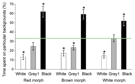 We chose three morphs with contrasting colourations: red, brown (corresponding to the wild type), and white. We hypothesised that: (1) Various morphs would differ either in their substratum colour preferences or in their match with the substratum colouration [10]; (2) The brown and red morph would show the highest preference for darker shades due to their dark colouration, whereas the white morph would choose lighter shades since its light colouration would be more visible on a dark background; (3) The brown morph would prefer a finely patterned background due to their spotted colouration, whereas more uniformly coloured red and white morphs would choose a coarse pattern.