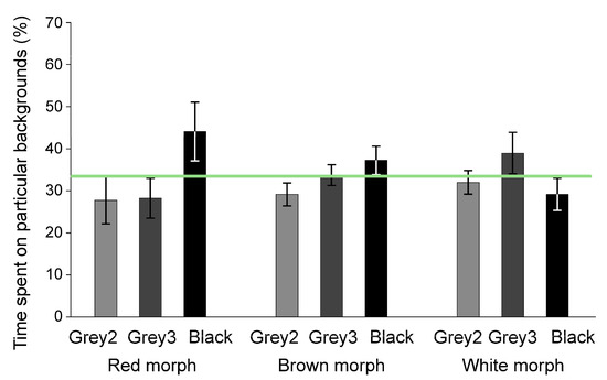 In Experiment 1, all the morphs selected the black background and avoided the white substratum (Figure 1, see Table S1 for the full statistics and Table S2 for the full raw data). In Experiment 2, all the morphs did not discriminate among the offered grey shades and the black background (Figure 2). In Experiment 3, the morphs differed in their preferences for background patterns: The red and brown morphs selected the coarse pattern, whereas the white morph did not discriminate between patterns (Figure 3). In Experiment 4, the red morph did not discriminate significantly (Table S1) between the red and matching grey backgrounds (56 vs. 44% of time, SE: 3.2%, respectively).