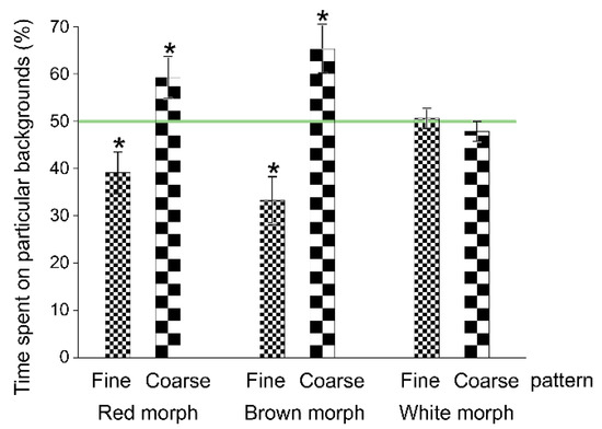 Preferences of shrimp morphs for different background patterns (fine and coarse black and white chessboard patterns with square sides of 1 and 10 mm, respectively) in Experiment 3 (means ± SE). Asterisks show significant departures from the neutral selectivity (50%) indicated by the horizontal line.