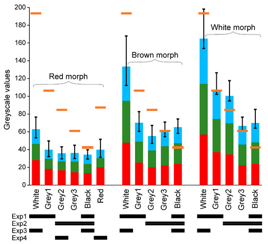 Measured (with ImageJ) shades (greyscale, 0: black, 255: white) of experimental backgrounds (orange bars) and shrimp bodies on the backgrounds (vertical bars). The modal values (the most common shades within the area) are shown. The bars are divided into red, green, blue components according to their shares in the body colouration. Error bars show the intraindividual standard deviations of the colour shades (the upper bar: the entire body, the lower bar: the abdomen only): the lower values indicate the more uniform body colouration. Black bars below the chart indicate experiments in which particular backgrounds and morphs were used.