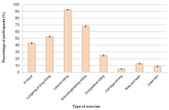 The types of exercise UK equestrians (n = 5427) reported doing with their horses at least once a week. Equestrians could select multiple exercise options; therefore, the exercise categories are not mutually exclusive. Error bars represent 95% confidence intervals.