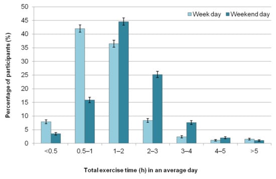The total time (hours) spent exercising all horses owned/cared for on an average day as reported by UK equestrians (n = 5424) for both weekdays (Monday to Friday) and weekend days (Saturday to Sunday). Most participants (84.4%) regularly exercised one or two horses. Error bars represent 95% confidence intervals.