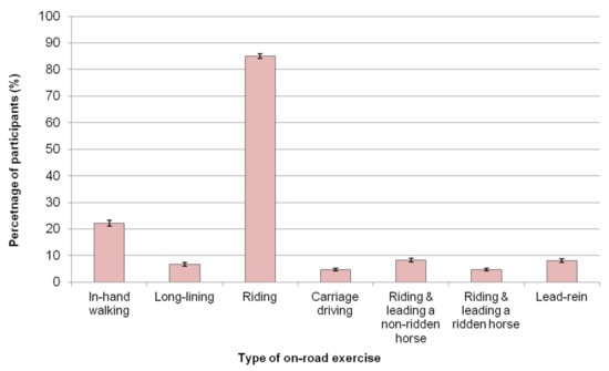The types of on-road exercise UK equestrians (n = 5426) reported doing with their horses at least once a week. Equestrians could select multiple exercise options; therefore, the exercise categories are not mutually exclusive. Error bars represent 95% confidence intervals.