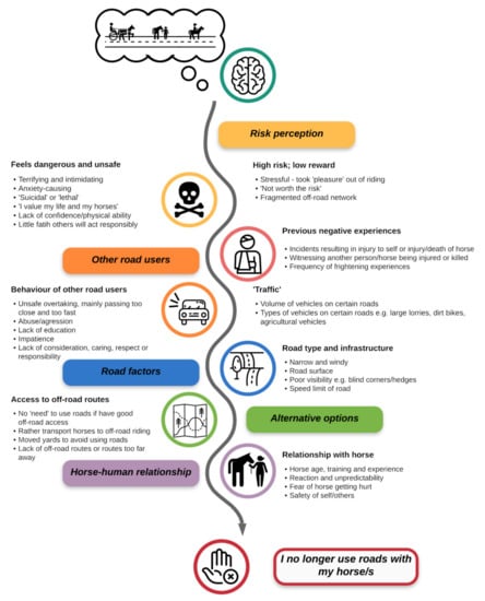 A depiction of the categories and themes which contribute to UK equestrians’ decisions to no longer use roads with their horses, based on each specific horse-human dyad and locale.