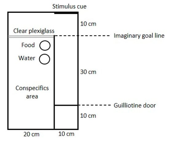 CJB is a common method to assess emotional states of animals [10]. It usually requires that the test subjects are trained to associate one stimulus with a positive outcome (usually food) and another stimulus with a negative outcome (e.g., no food). Once trained, their reactions to an ambiguous stimulus, combining features of the positive and the negative ones, are recorded. The training normally takes a long time, which makes the method unsuitable for studying many animals at a specific age. Hence, we used the method developed by Salmeto and colleagues [21], which relies on the innate propensities of chickens to maintain social contact, and to instinctively avoid predators. It can therefore be applied without previous training. The method has been validated and found to reliably induce a pessimistic response following acute stress [21].