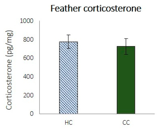 The down feather CORT levels in HCs and CCs are shown in Figure 3. One severe outlier was removed from the HC group before testing and was not included in the averages shown in Figure 3. (CORT level: 2733 pg/mg feathers). There were no significant differences between the treatments (t (35) = 0.448, p = 0.657).