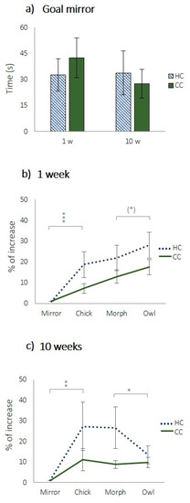 Latency to reach goal line in the straight alley maze in (a) seconds when exposed to mirror, and (b,c) in % increase compared to mirror at (b) 1, and (c) 10 weeks of age, where HC = hatchery stressed chicks, and CC = control chicks, (*) p < 0.1, * p < 0.05, ** p < 0.01, *** p < 0.001.
