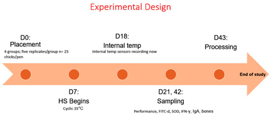 Experimental design is summarized in Figure 1. This study was conducted at the Poultry Experimental Research Laboratory (PERL) facility at the University of Arkansas during late summer (July–August), which includes individual environmentally controlled rooms equipped with their own air conditioning unit and digital thermostat to control temperature. Day-of-hatch Cobb 500 male broiler chicks (n = 500) were obtained from a commercial hatchery. Upon arrival, all chickens were vaccinated with a coccidia vaccine (Coccivac®-B52, Merck Animal Health, Maxton, NC, USA), neck tagged, and randomly distributed into four groups. Group 1: HS control + control diets; Group 2: HS + control diets supplemented with 37 ppm EO of Lippia origanoides (LO); Group 3: HS + control diets supplemented with 45 ppm LO + 45 ppm EO of Rosmarinus officinalis (RO) + 300 ppm beetroot; Group 4: HS + 45 ppm LO + 45 ppm RO + 300 ppm Natural Betaine.