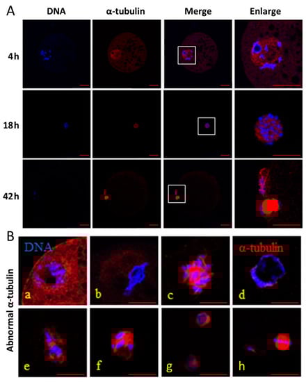 Effect of heat stress (HS) and melatonin on the normal rate of α-tubulin in the porcine oocytes during in vitro maturation (IVM). DNA (blue) is stained by Hoechst 33342, and α-tubulin (red) is stained using an anti-α-tubulin antibody. (A): normal α-tubulin and DNA in the oocytes during IVM at 4, 18 and 42 h, respectively. (B): abnormal α-tubulin and DNA in the oocytes during IVM (a,b for 4 h; c–f for 18 h; g and h for 42 h). Bar = 20 μm.