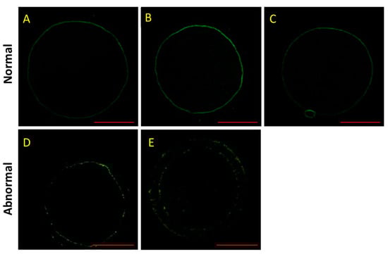 Effect of heat stress (HS) and melatonin on the normal rate of F-actin in the porcine oocytes during in vitro maturation (IVM). F-actin is stained using phalloidin (green). (A–C) are the representative images of normal F-actin in the porcine oocytes during IVM at 4, 18 and 42 h, respectively. (D,E) are the representative images of abnormal F-actin in porcine oocytes during IVM. Bar = 50.