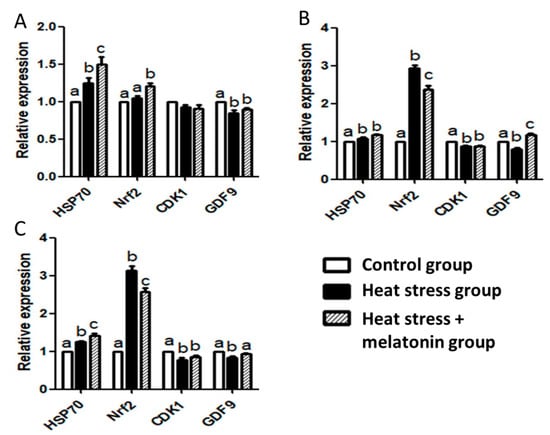 Effect of heat stress (HS) and melatonin on expression of HSP70, NRF2, CDK1 and GDF9 mRNA in the porcine oocytes during in vitro maturation (IVM). (A): effect of HS and melatonin on the oocytes during IVM at 4 h; (B): effect of HS and melatonin on the oocytes during IVM at 18 h; (C): effect of HS and melatonin on the oocytes during IVM at 42 h. Different letters: a,b,c in the different patterned columns represent significant difference (p < 0.05).