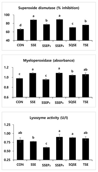 Serum SOD was measured using an assay kit (Sigma-Aldrich, St. Louis, MI, USA, 19160), following the manufacturer’s guidelines. This method is based on inhibition against WST (Water soluble tetrazolium dye) and determination of SOD enzyme activity. The absorbance was read at 450 nm after incubating samples for 20 min at 37 °C. Lysozyme activity was used for determination of serum lysozyme level by the method described by Hultmark et al. [33] with slight modifications. Lysozyme activity was determined by reaction against Micrococcus lysodeikticus and microplate reader (Sunrise TECAN, Männedorf, Switzerland) analysis with 450 nm. Myeloperoxidase (MPO) was measured according to Quade and Roth [34]. Briefly, 20 µL of serum was diluted with Hanks balanced salt solution (HBSS) without Ca2+ or Mg2+ in 96-well plates. Then, 35 µL o f 3.3′5.5′- tetramethylbenzidine hydrochloride (TMB, 20 mM) (Sigma-Aldrich) and H2O2 (5 mM) were added. The color change reaction was stopped after 2 min by adding 35 µL of 4 M sulfuric acid. Absorbance was read at 450 nm in the micro-plate reader.