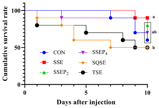 Cumulative survival rate of Nile tilapia fed six experimental diets in triplicate (n = 3) and challenged with Aeromonas hydrophila (1 × 106 CFU/fish) for 10 days. Different letters (a,b) indicate a significant difference (p < 0.05).