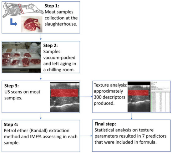 Therefore, the aim of the present study was the application of US imaging and texture analysis for the estimation of IMF% from portions of longissimus thoracis muscle mass, by development and testing of a prediction equation, which may be used to predict the IMF meat content.
