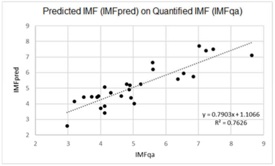 The difference between IMFqa and IMFpred means was −0.04 (±0.70 SD), with a determination coefficient of R2 = 0.76. Scatterplot in Figure 2 graphically explains the correspondence between IMFqa and IMFpred where a linear correlation was evident (R2 = 0.76).