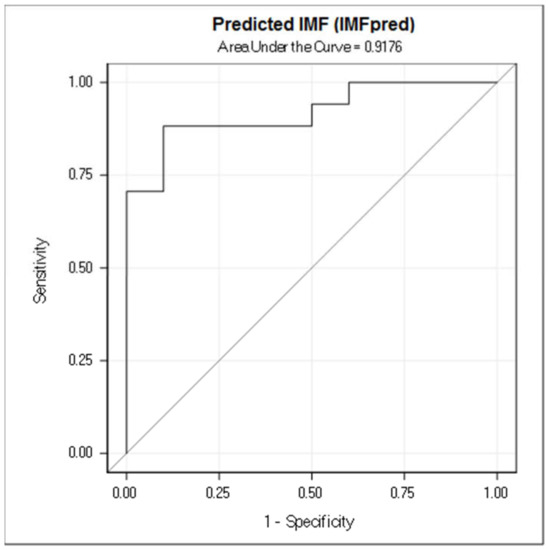 Figure 3 illustrates the results from the ROC analysis, describing the estimation of lipid content percentage in the muscle performed with IMFpred. The Area Under the Curve was found to be 92% (0.9176; 95% CI: 0.8141–1.0000; positive likelihood ratio = 16.9749) and using an optimal cut-off value of 4.50 IMF%, sensitivity was 88% and specificity was 90%.