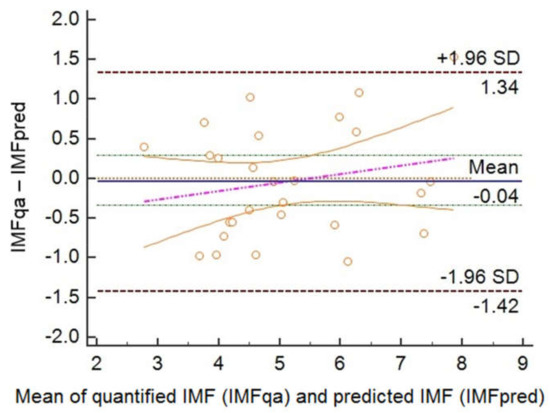 Moreover, a Bland-Altman plot was used to test the agreement between IMFqa and IMFpred (Figure 4). The results from the plot showed an upper limit of +1.34 and a lower limit of −1.42 (±1.96 SD), with a mean of −0.04. All the variables included were statistically significant.