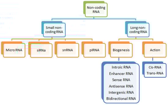 Eukaryotic genomes are known to produce a huge array of RNA molecules differing in their size, abundance, and protein coding ability []. Only 2% of RNA is translated to make proteins; other RNA sequences that do not code for any protein are called non-coding RNA (ncRNAs) []. While the proteins are considered as the major trans-acting regulators, they are limited by the organizational complexity in forming a regulatory network. This is partially explained by the alternative splicing in the pre-mRNA of protein-coding genes and by the post-translational modification of proteins []. A paradigm shift has occurred in recent years with the identification and functional characterization of an increasing number of ncRNAs. The knowledge of ncRNAs has gained a huge momentum with the discovery of RNA interference (RNAi) and the role of ncRNAs in gene silencing phenomena []. This has led to the identification of various types of small ncRNAs, which guide the protein complex to the target mRNA to influence its translation. The ncRNAs include ribosomal RNA (rRNA), transfer RNA (tRNA), small ncRNAs (sncRNAs), and long ncRNAs (lncRNAs) (Figure 1). The discovery of rRNA and tRNA dates back to the 1950s, whereas sncRNAs and lncRNAs are relatively recent discoveries []. As per our current understanding, molecular size is the distinguishing feature between sncRNAs and lncRNAs []. SncRNAs, which have a size <200 nucleotides include microRNA (miRNA), small interfering RNA (siRNA), small nuclear RNA (snRNA), and PIWI-interacting RNAs (piRNAs), whereas the ncRNAs of size >200 nucleotides belong to the category of lncRNAs and are present in almost all the eukaryotic organisms [].