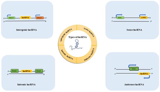 LncRNAs can be categorized based on the region of the genome from which they are transcribed: (1) Sense lncRNAs overlap the exonic regions of another transcript produced from the same strand; (2) Antisense lncRNAs are located on the complementary strand of the sense strand; (3) Intergenic lncRNAs (lincRNAs) are those produced from the DNA between two genes (Intergenic regions); and (4) bidirectional lncRNAs are transcribed simultaneously to coding transcripts at the opposite strand [] (Figure 2).