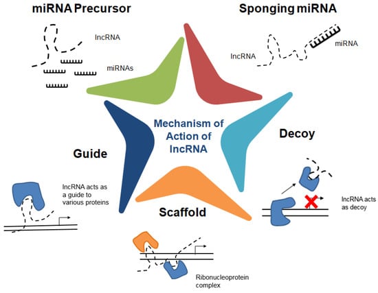 Since, lncRNAs are relatively less conserved across species, investigating their biological importance as well as their mechanism of action is a difficult task. The discovery of lncRNAs and their functions to date suggest their roles in different biological processes via gene regulation by serving as molecular signals, guides, decoys, and/or scaffolds (Figure 3) []. LncRNAs can bind with DNA, RNA, and proteins to regulate gene expressions both at the transcriptional as well as post-transcriptional level. There are different computational approaches for the identification of lncRNAs from the genome as well as transcriptome data, investigation of lncRNA functions, and its associated regulatory networks. Although identifying lncRNAs is out of the question from whole exome sequencing, recent reports including ours have shown how the third generation sequencing technology is used to screen the lncRNAs from exomes [,]. Nevertheless, the lncRNAs are ascertained as differentially expressed gene (DEG) counts and many of them turn out to be up/downregulated. These could be from 5′-UTR or intergenic or regulating from the intron-exon boundaries. They are validated using downstream approaches like qRT-PCR or further validation checks. A detailed characterization and potential identification of long read/short-read sequencing were beyond the scope of this review even as potential lncRNAs could be screened from either of these technologies [].