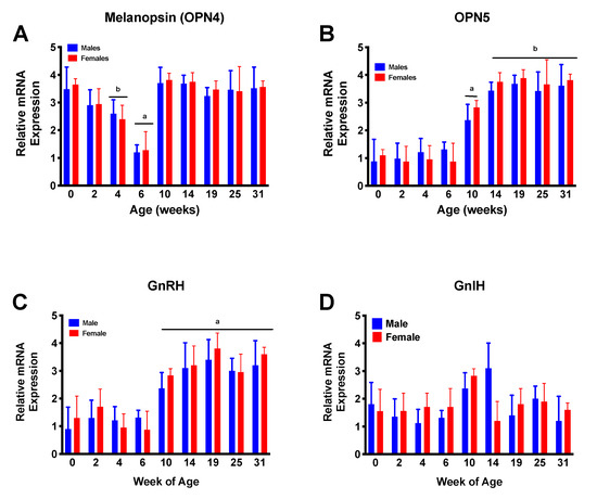Figure 1. Ontogeny of relative mRNA expression of opsin 4 (OPN4; (A)), opsin 5 (OPN5; (B)), gonadotropin releasing hormone (GnRH; (C)), and gonadotropin inhibitory hormone (GnIH; (D)). Relative OPN4 expression was high just after hatch then dropped over the first 6 weeks of life, then once again increased prior to the increase in relative GnRH mRNA expression. OPN5 expression remained low until prior to the increase in GnRH expression. No differences were observed in GnIH relative mRNA expression at any age. Letters indicate statistically different groups at p < 0.05.