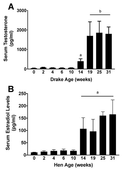 Figure 2. Serum T and E2 concentrations in drakes and hens, respectively. (A) Serum T concentrations in drakes are at minimal concentrations from hatch through 10 weeks of age. T concentrations were significantly greater by 14 weeks of age, and again significantly increased 19 weeks and maintained into adulthood. Letters indicate statistically significant groups, a = p < 0.05, b = p < 0.01. (B) Serum E2 concentrations were also at baseline from hatch through week 10 and were significantly increased to adult-like concentrations by week 19. a = p < 0.001. Data suggest that gonadal development is occurring by week 14 and may be more advanced in hens compared to drakes.