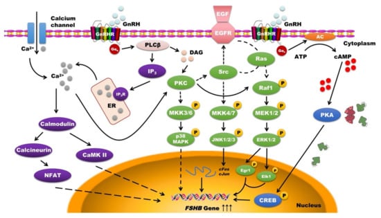 Many studies have shown that GnRH induces the activation of protein kinase C (PKC) in cells, which can activate a variety of MAPK cascades [146], and then MAPKs translocate to the nucleus and activate multiple transcription factors to participate in the regulation of FSHB transcription [159]. According to reports, the activation of family members, MAPK1/3 (ERK1/2), MAPK8/9 (JNK1/2) and MAPK14 (p38-α) all mediate the GnRH-induced transcription of FSHB [147,160]. These MAPK cascades, especially the ERK signaling pathway, have been recognized to regulate the activity of the FSHB promoter in response to GnRH pulse stimulation [161]. In particular, ERK activation occurred more rapidly, activation was more sustained, and the level of nuclear phosphorylated ERK was also higher under stimulation with a low GnRH pulse frequency [161]. However, it was found that the specific knockout of ERK1/2 only partially impaired the expression of FSHB and FSH secretion, but the effect on the expression of Lhb and LH secretion was more obvious through in vivo verification after the construction of FSH-specific ERK1/2 double knockout mice [162]. This may also imply that the regulatory effect of ERK1/2 may be more important for LH than for FSH, or there may be other GnRH-activated signaling pathways that can compensate for the loss of ERK1/2 function in double knockout mice to maintain the secretion of FSH.