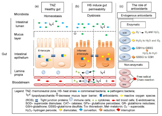 The condition of the gut under thermoneutral zone (a) is normal and is considered a healthy gut, as there is a homeostasis in microbiota, antioxidant to ROS balance and a fully functional gut epithelium that prevents the entry of bacteria and toxins. (b) HS induces gut permeability, which causes OS due to the imbalance between the endogenous antioxidants and ROS. It also allows translocation of pathogenic bacteria and toxins into the blood circulation via paracellular transport due to the disruptions of TJs and can lead to endotoxemia. (c) The role of endogenous antioxidants in cellular redox balance through elimination of ROS.