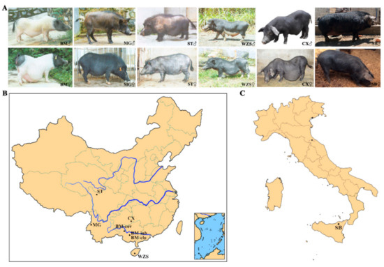 The photos and geographical distribution of miniature pigs and Sicilian black pig. (A) The photos of miniature pigs and Sicilian black pig. (B) Geographical distributions of the seven miniature pig populations in China. (C) Geographical distributions of Sicilian black pigs in Italy. BM: Bama miniature pig, MG: Mingguang small ear pig, ST: Tibetan pig in Sichuan province, WZS: Wuzhishan pig, CX: Congjiang Xiang pig, SB: Sicilian black pig. BM-clo, BM-inb, and BM-cov are three subpopulations of Bama pigs, kept in the national conservation farm (BM-cov), a closed herd (BM-clo), and a highly inbred line (BM-inb) in Guangxi University. The abbreviation for pig applies to all figures and tables.