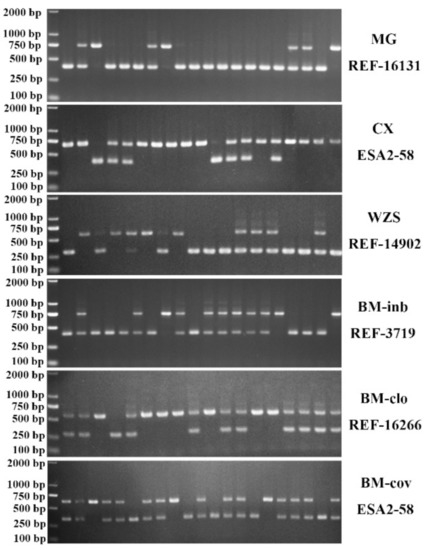 A representative electropherogram of SINE RIPs used for detection in the pig populations. MG: Mingguang small ear pig, WZS: Wuzhishan pig, CX: Congjiang Xiang pig, BM-clo, BM-inb, and BM-cov are three subpopulations of Bama pigs, kept in the national conservation farm (BM-cov), a closed herd (BM-clo) and a highly inbred line (BM-inb) in Guangxi University. REF-16131, ESA2-58, REF-14902, REF-3719, REF-16266 were SINE RIP name.