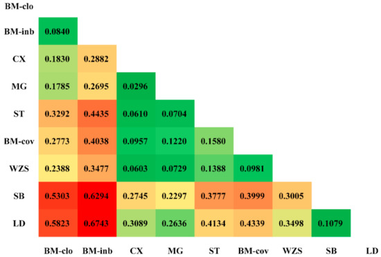 For genetic differences among populations, the FST value was 0.3780 when all loci were considered, indicating that approximately 37.80% of the total genetic variation between breeds, while the remaining 62.20% were attributed to differences among individuals within a breed (Table 1). For each individual locus, this value ranged from 0.0273 (REF-5597) to 0.8800 (REF-13182). The heatmap of the pairwise Fst values among these populations is shown in Figure 3. Overall, the BM-clo and BM-inb populations showed a relatively higher degree of distance from the BM-cov compared to Congjiang Xiang, Mingguang small ear, Wuzhishan, Tibetan, and BM-cov. Estimates of the BM-clo and BM-inb against the BM-cov were 0.2773 and 0.4038, respectively, while the average differentiations among other miniature pigs (Congjiang Xiang, Mingguang small ear, Wuzhishan, Tibetan, and BM-cov) was 0.0907 ± 0.0376. Both BM-clo and BM-inb showed a relatively high genetic difference against other miniature pig populations as well as the Italian breed and Landrace. The genetic difference between BM-inb and Landrace was highest (Fst = 0.6743) and followed by the BM-inb and Sicilian black pair comparison (Fst = 0.6294).