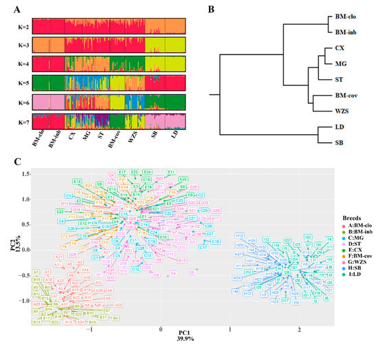 To measure the population structure and degree of admixture, we applied the STRUCTURE algorithm and principal component analysis (PCA), and the UPGMA tree was generated based on the Nei’s genetic distance. We analyzed the grouping situation when K ranged from 2 to 7, meaning that we presupposed that all individuals originated from K ancestors or breeds. The cluster results based on STRUCTURE are shown in Figure 4A. Interestingly, BM-clo and BM-inb were separated from the other breeds when K = 2, and they lacked any affinity with Chinese miniature pigs, even BM-cov. When K = 3, the European pigs (Sicilian black) and Landrace were separated from Chinese miniature pigs and formed three distinct ancestries; Congjiang Xiang, Mingguang small ear, Tibetan, and BM-cov had large proportions of common ancestry. This agrees with the results of the PCA and the UPGMA tree analyses, which placed the BM-inb and BM-clo as a distinct cluster from the other miniature pigs (Congjiang Xiang, Mingguang small ear, Tibetan, BM-cov, and Wuzhishan), and the outbreed Sicilian black pigs and Landrace pigs (Figure 4B,C). A particular feature at K = 4 is that Congjiang Xiang, Mingguang small ear, Tibetan were separated completely from BM-cov and Wuzhishan. BM-cov breed clearly shares a common ancestry with the Wuzhishan breed, which also agrees with the UPGMA tree analysis. BM-cov and Wuzhishan had a tendency to group in a new subclade, while Congjiang Xiang, Mingguang small ear, and Tibetan also tend to cluster in the same subclade (Figure 4C). BM-cov separated from Wuzhishan when K ≥ 5. Progressively, as K increased, the contributions of the assumed populations resulted in the complete separation of the seven breeds.