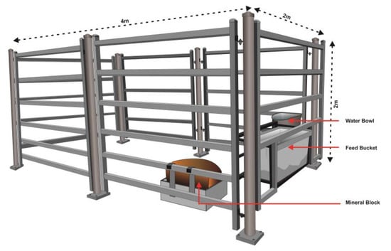 This study was conducted over 14 days. The first seven days involved a habituation period then followed by a seven-day experimental period. All cattle were situated in individual rectangular pens with a dimension of 4 m (length) × 2 m (width) × 2 m (height) within an animal house (Figure 2), and were offered oaten chaff in buckets and water in automatic water bowls, ad libitum. The automated drinking bowls were approximately 75 cm above the floor on the left-hand side of the pens. Four commercial mineral block supplements (22 cm length × 22 cm width × 25 cm height) weighing approximately 16 kg, consisting of 7% urea and 10% molasses (Peak 50; Olsson’s Pacific Salt®, Yennora, NSW, Australia), were strapped to a metal frame (22.5 cm length × 22.5 cm width × 5 cm height) attached to the right-hand side of the pen’s panels and placed on the concrete floor alongside individual cattle.